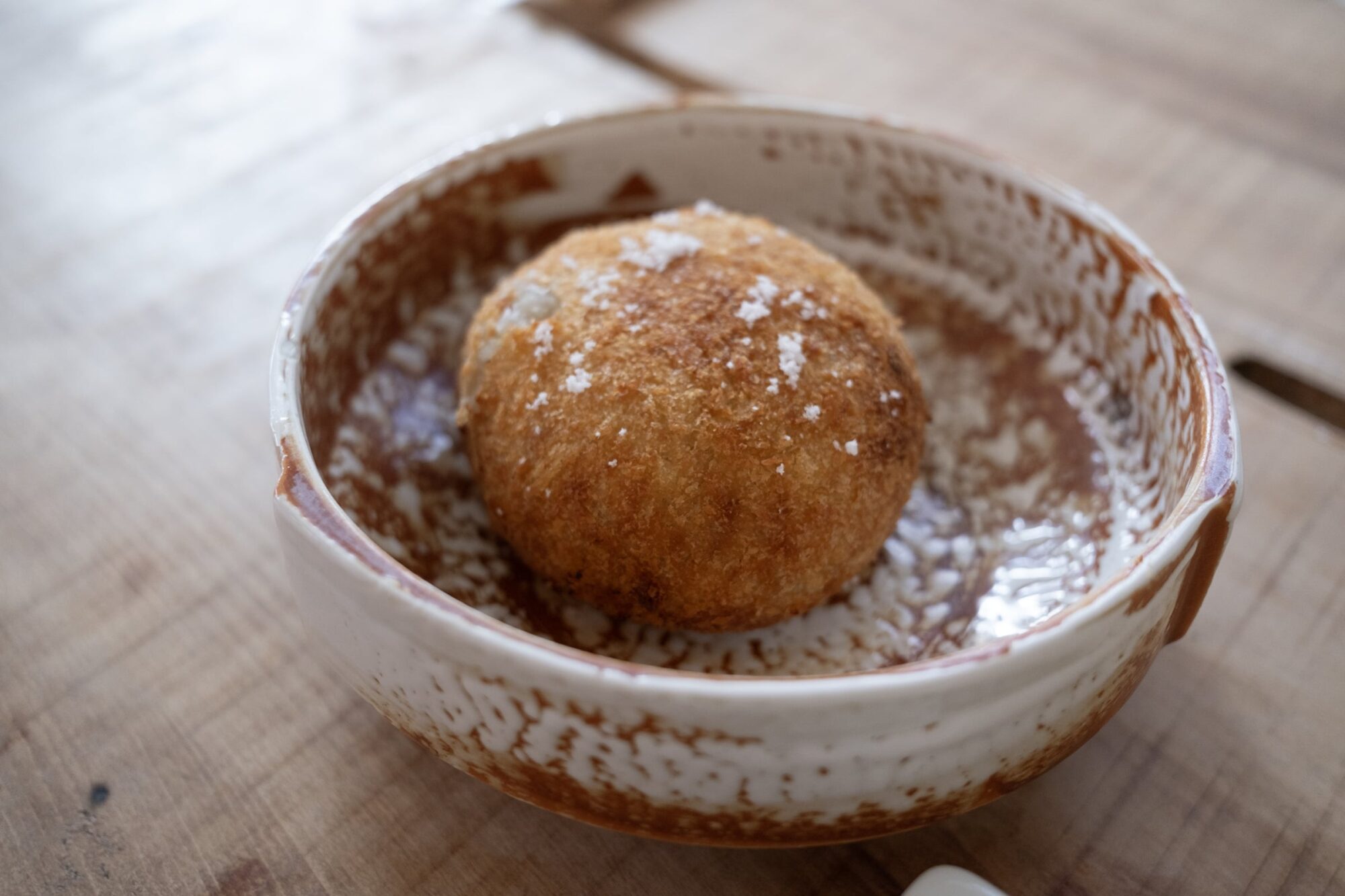 ほく甘コロッケ、というだけあって、本当にほくほくで甘くてめちゃくちゃおいしいです。愛媛の伊予牛を使った牛肉コロッケ。甘いだけでなく、ちょうどいい具合に胡椒も効いていて、なおかつ衣にかかった塩が絶妙なバランス。これはたしかにソースなんて不要ですね。