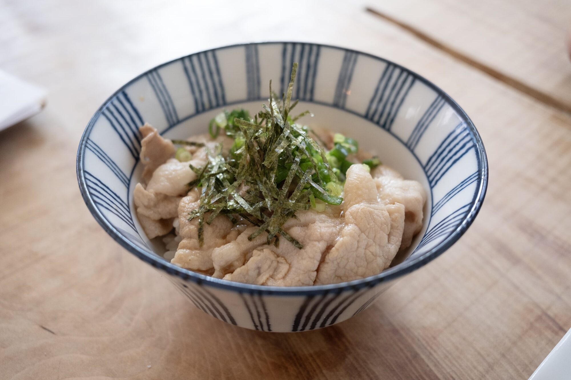 こちらはセットの小丼「信州飯山みゆきポークのやわらか豚丼」。甘くてやわらかい豚肉がたっぷりのった丼もおいしくて箸が止まりません。丁寧な料理の一品一品に感動があります。